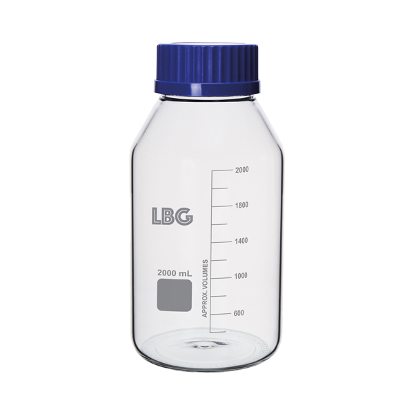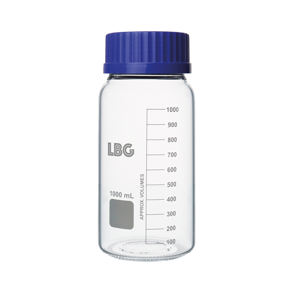 Fabricados en vidrio borosilicato 3.3. Totalmente autoclavable. Rosca GL80, según ISO 4796. Boca ancha que permite un llenado cómodo. Graduados. Incluye anillo antigoteo y tapón de polipropileno azul