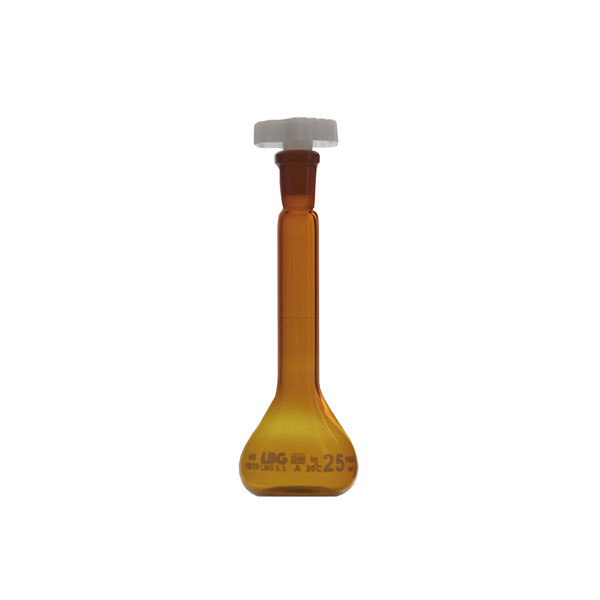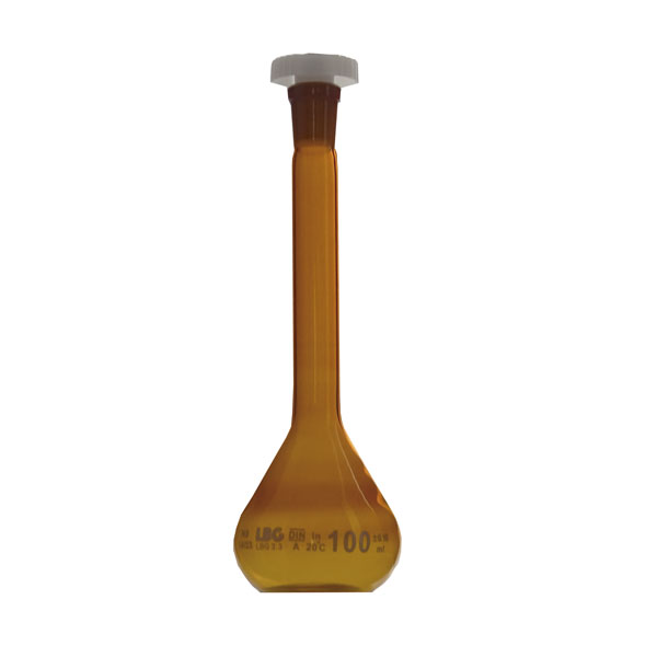 Con tapón de PE y fabricado en vidrio borosilicato LBG 3.3 ámbar. Diseñado según norma ISO 1042, DIN 12664 y calibrado “para contener” (TC, In). Certificado de lote incluido (se descarga gratuitamente desde aquí)