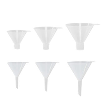 PACK COMPLETO – Incluye 6 embudos de plástico PP (3 de vástago largo y 3 de vástago corto), en diferentes diámetros de 65, 90 y 100 mm. Rama corta, dimensiones vástago: longitud 70 mm – diámetro 18; longitud 82 mm – diámetro 24 mm: longitud 94 mm – diámetro 26 mm. Rama larga, dimensiones vástago: longitud 101 – diámetro 9,5 mm; longitud 134 mm – diámetro 10 mm; longitud 147 mm – 12 mm.