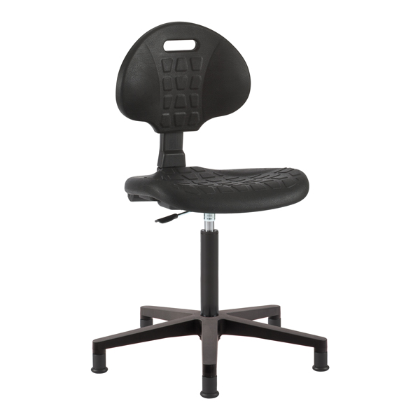 Cinco pies, asiento rotatorio. Para trabajo sentado en altura de 90 cm. Material del asiento/espalda: Poliuretano antideslizante, fácil de limpiar. Resistente a la abrasión y productos de limpieza. Rango de ajuste de altura del asiento: 50-70 cm. Asiento ajustable mediante elevación de gas. Dimensiones del asiento (anchura x profundidad): 41 cm x 54 cm. Dimensiones del respaldo (anchura x altura): 42 x 39 cm. Base: poliamida negra con fibra de vidrio, diámetro de base: 60 cm. No incluye reposabrazos. Se entrega sin montar. Garantía 5 años