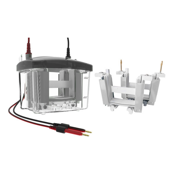 Sistema vertical robusto para PAGE y SDS-PAGE. Incluye placas de vidrio con juntas integradas para evitar fugas de gel. Bastidor con sistema de cierre tipo leva que asegura una alineación precisa. Peines especiales que no interfieren con la polimerización del gel. Capacidad para correr 4 geles simultáneamente. Tiempo de corrida estándar de 45 minutos a 200 V. Compatible con sistema de transferencia Volt TX90